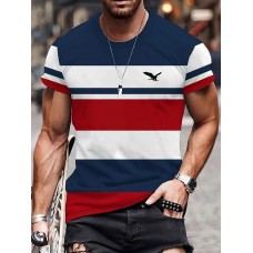 メンズカジュアルストライプTシャツ - 半袖、ラウンドネック、伸縮性ポリエステル生地、洗濯機可、ブルー/ホワイト/レッド迷彩柄と鳥のグラフィック、夏の必須アイテム