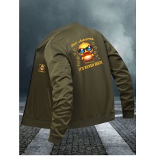 メンズ ビビッドレッド キャラクターダック グラフィック ボンバージャケット 「イッツ ネバー トゥー ダック」プリント、ジッパーフロント、ベースボールカラー&サイドポケット付き オールシーズン カジュアル ポリエステルコート