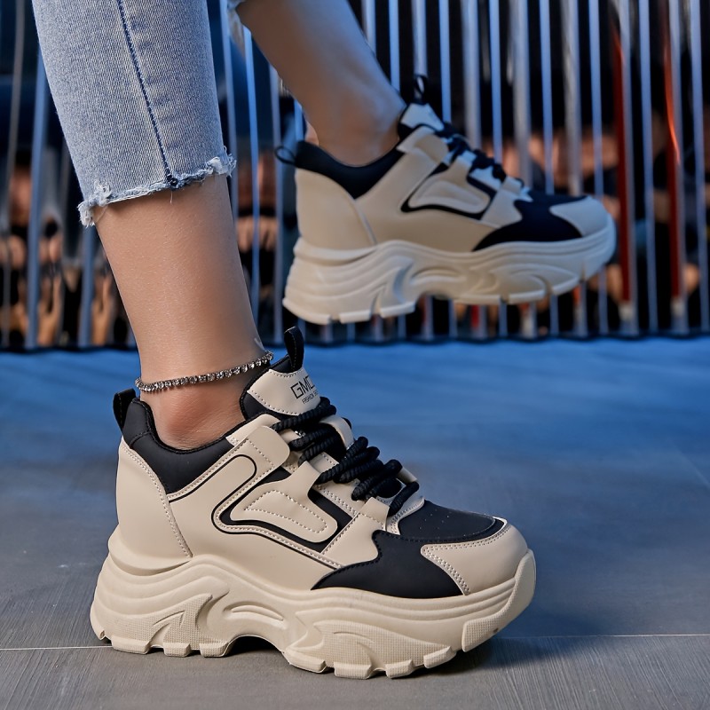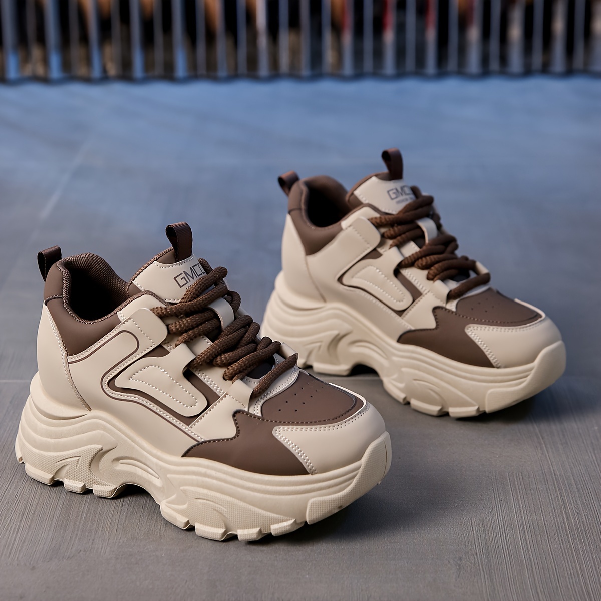 • レディース レトロスタイル 軽量 プラットフォームスニーカー、レースアップローカットカジュアルシューズ、PUレザーアッパー、ラバーソール、EVAインソール